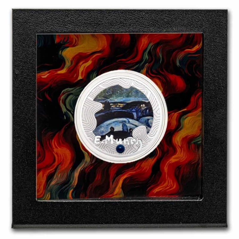 This artistic silver coin is dedicated to the renowned painting Love and Pain by Norwegian artist Edvard Munch. The reverse features a man and a woman in an embrace, with the woman kissing the man’s neck. The painting is a symbol of complex human relationships, exploring the depths of love and suffering. Struck in Proof quality, the coin includes an agate inlay and digital printing. It is presented in a special case with a certificate of authenticity. The mintage is limited to just 700 pieces worldwide.
