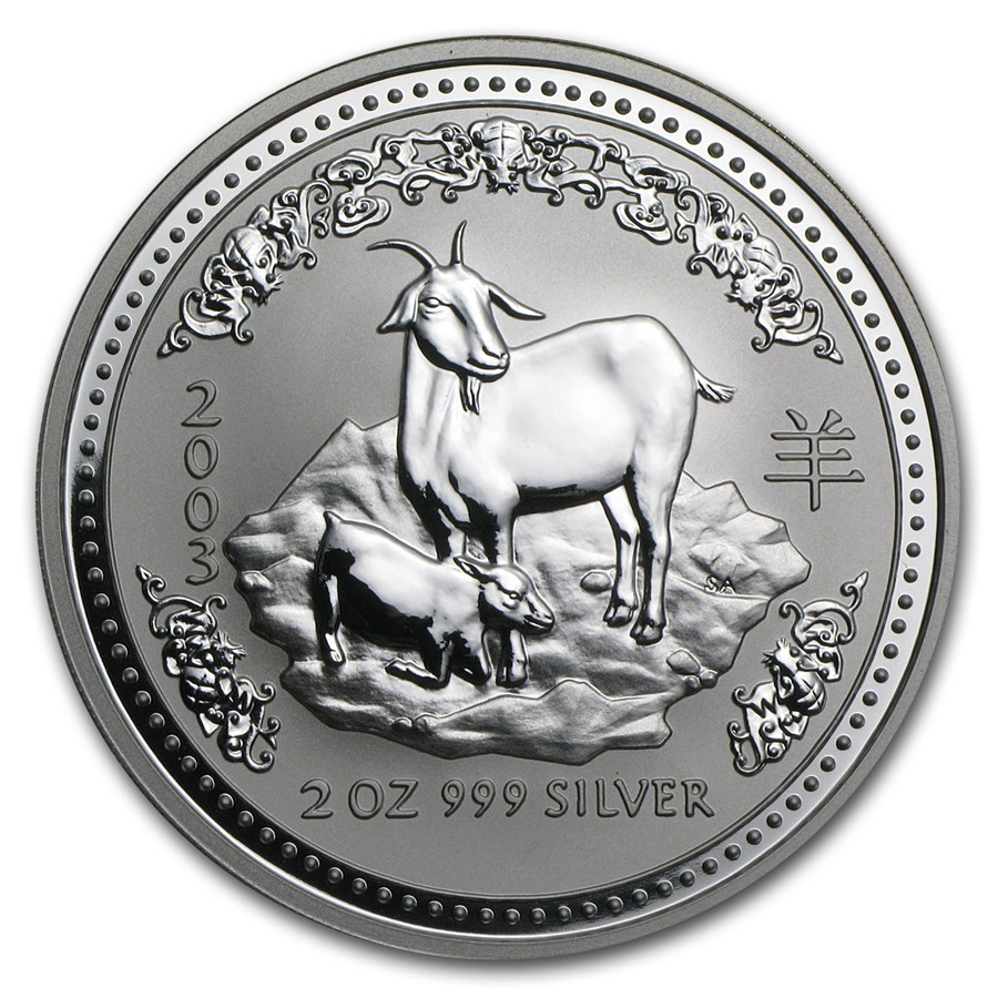La moneda de plata de 2003 pesa 2 onzas y está fabricada con plata de ley 0,999. Está dedicada al signo zodiacal chino de la Cabra. El reverso, diseñado por la artista Sarah Anderson, muestra la imagen de una cabra con un cabrito sobre un fondo de piedras que simbolizan la paz, la armonía y los valores familiares. En el anverso figura un retrato de Su Majestad la Reina Isabel II realizado por Ian Rank-Broadley, así como la denominación y el país de emisión.