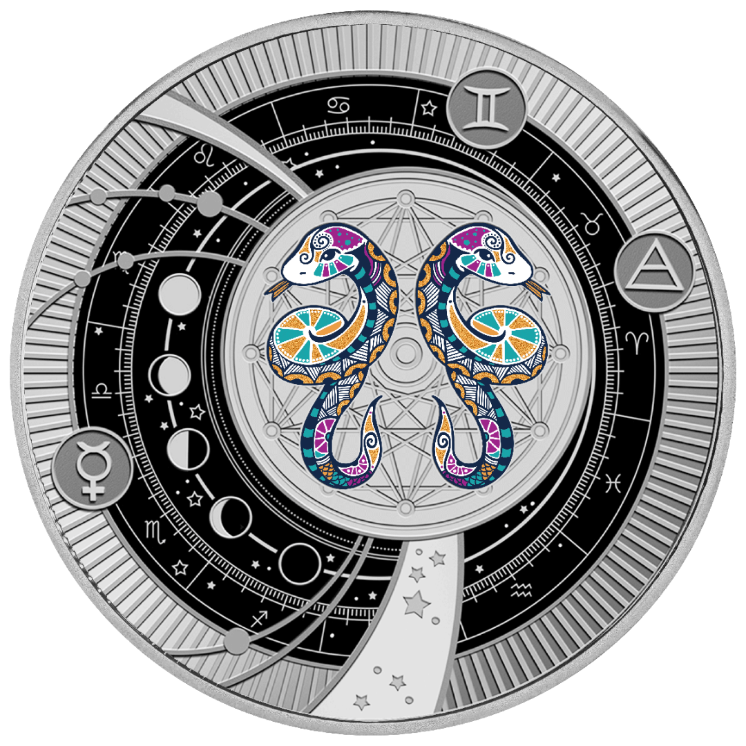 Esta elegante moneda de plata de la serie "Signos del Zodíaco" está dedicada a Géminis, signo que encarna la dualidad, la curiosidad y la sed insaciable de nuevas experiencias. Acuñada en calidad Proof, impresiona por su color brillante y sus exquisitos detalles. Una característica especial de la moneda es su elegante anillo colgante, que permite lucirla como una elegante pieza de joyería. El reverso muestra dos serpientes, que simbolizan la unidad reflejada de las almas y la energía mágica de Géminis. La moneda se entrega en un estuche con certificado de autenticidad y está limitada a 599 piezas en todo el mundo.