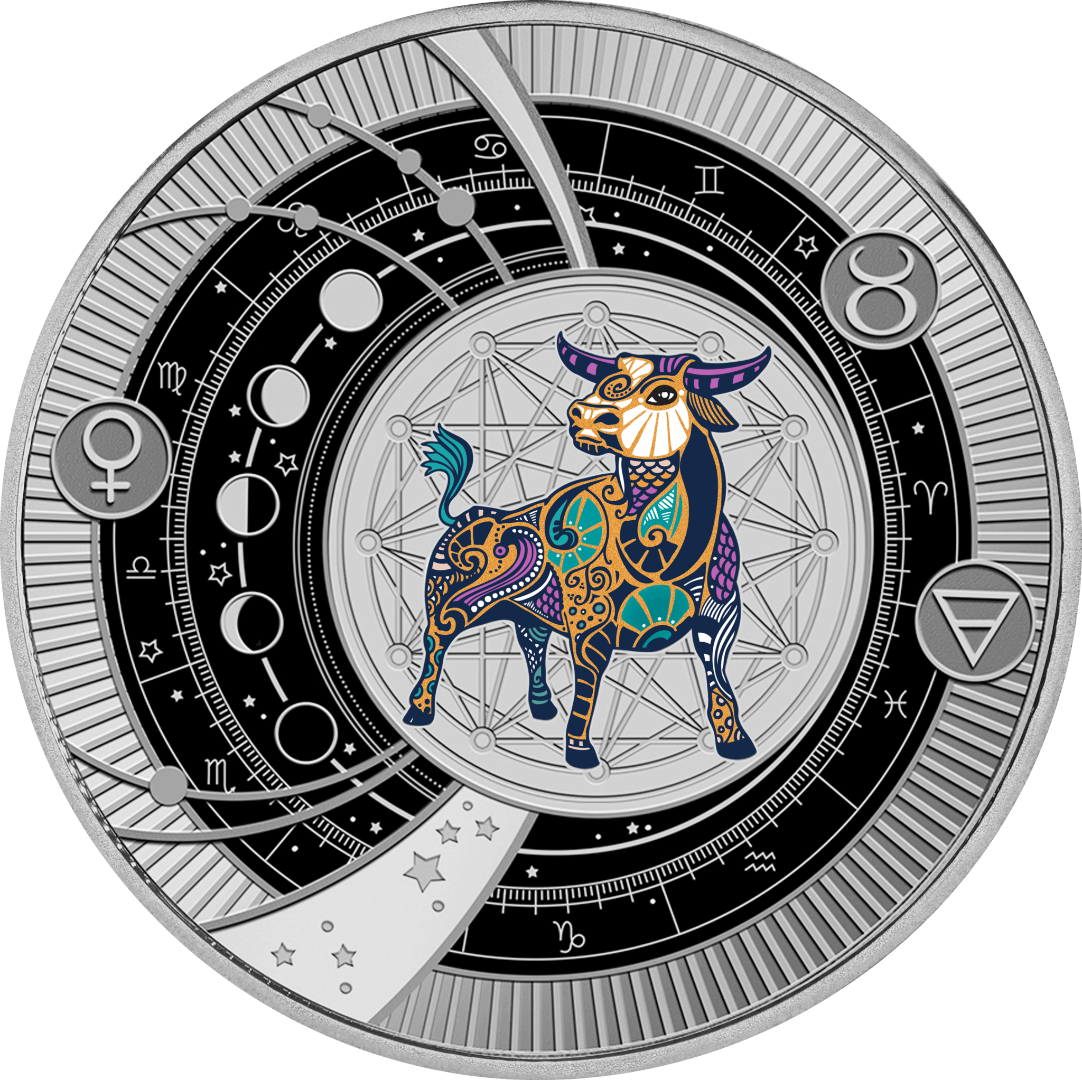 Camerún: moneda de colección en plata Signos del Zodíaco. Tauro 2025 (colgante), Proof, coloreada, 10 g de plata pura (0,999)