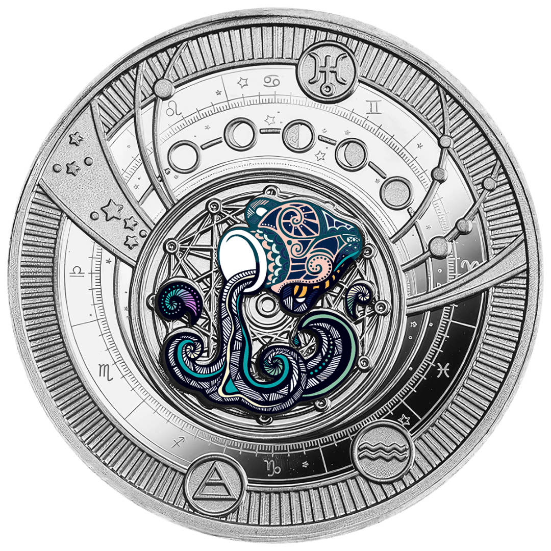 Esta exquisita moneda de plata de la serie "Signos del Zodíaco" está dedicada a Acuario, un signo de aire amante de la libertad y creativo que encuentra la inspiración en la independencia y las nuevas ideas. Acuñada en calidad Proof con colores brillantes y los más finos detalles, resalta la sofisticación de la moneda. Un elegante anillo colgante permite llevar la moneda como joya, manteniendo su simbolismo de inspiración y libertad cerca de ti. El reverso muestra un portador de agua en tonos azules y morados, con elegantes motivos cósmicos que representan la creatividad y el intelecto de Acuario. La moneda se entrega en un estuche con certificado de autenticidad y está limitada a sólo 599 piezas en todo el mundo.