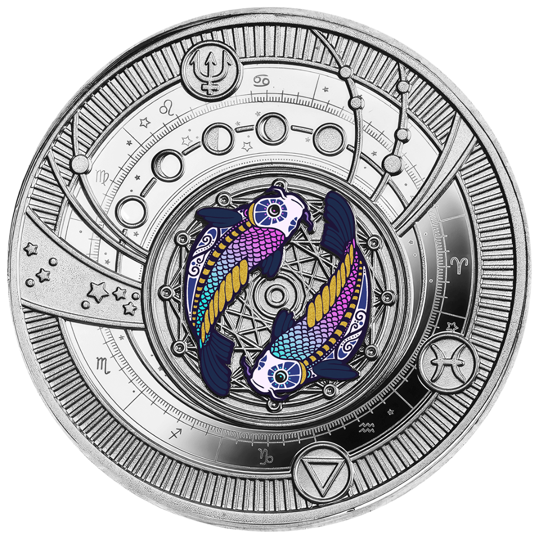 Esta exquisita moneda de plata forma parte de la serie "Signos del Zodíaco" y está dedicada a Piscis, el misterioso y sensual signo de agua regido por Neptuno. Encarna la profundidad de la intuición, la emotividad y la naturaleza artística de los nacidos bajo este signo. La moneda está acuñada en calidad Proof, con detalles de filigrana y un brillante acento de color. Un elegante anillo colgante permite lucirla como joya, resaltando el estilo refinado y la armonía interior de su propietario. La moneda se entrega en un estuche con certificado de autenticidad y está estrictamente limitada a sólo 599 piezas en todo el mundo.