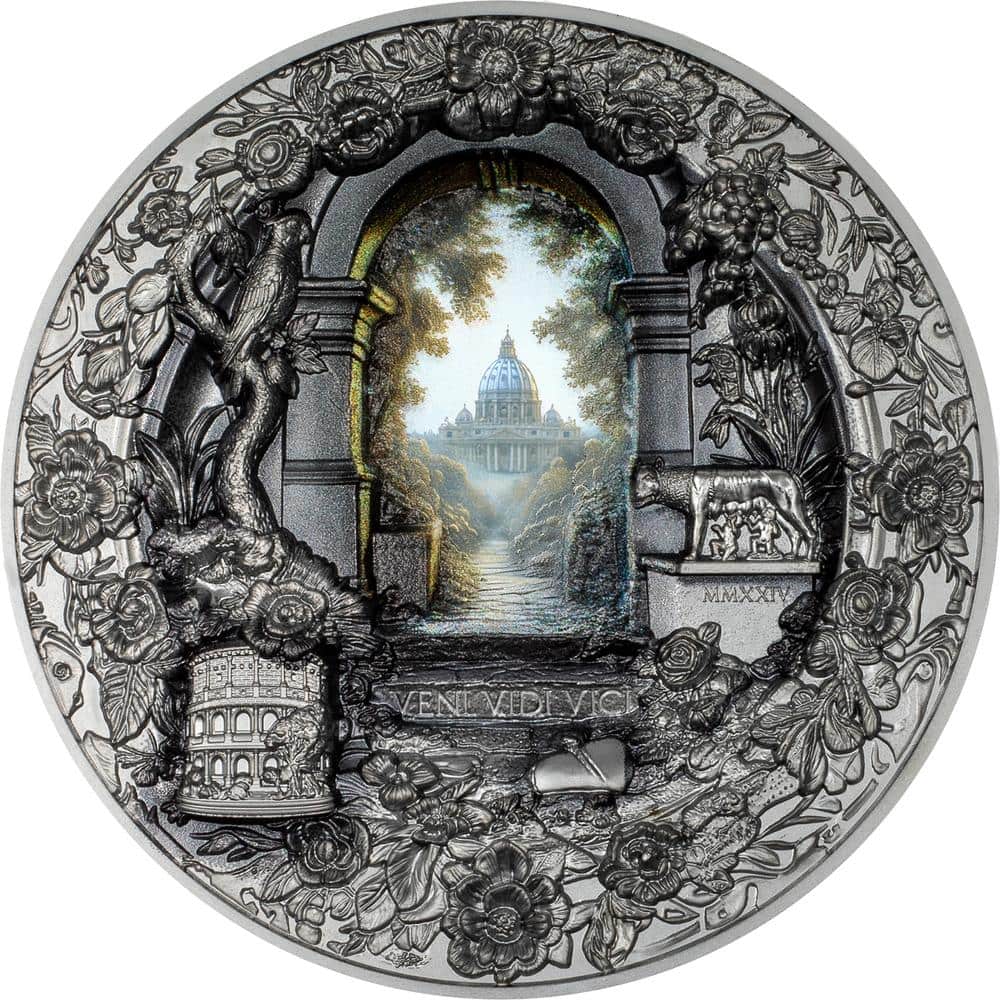 Esta impresionante moneda de plata de 3 onzas forma parte de la serie "Vista Monumental", dedicada a los lugares emblemáticos de Italia. El diseño presenta una elegante visión arquitectónica de Roma: la majestuosa Basílica de San Pedro, como vista a través del famoso ojo de la cerradura de los Caballeros de Malta, rodeada de símbolos de la Ciudad Eterna. Acuñada en calidad Black Proof, la moneda resalta la profundidad del diseño y el sorprendente contraste de sus formas. Se entrega en un estuche con certificado de autenticidad. La tirada limitada es de 499 piezas en todo el mundo.
