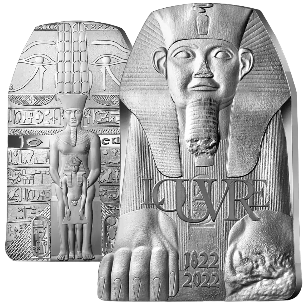 Emitida en 2022 por la Monnaie de Paris en colaboración con el Museo del Louvre, esta moneda de plata Proof contiene 22,2 g de plata de ley 0,999. La denominación es de 10 euros y la tirada está limitada a 5.000 piezas. Esta moneda forma parte de la serie French Excellence, que rinde homenaje a dos instituciones históricas situadas en orillas opuestas del Sena. La moneda está dedicada al tema "Tesoros de Egipto" y conmemora el bicentenario del desciframiento de los jeroglíficos (1822-2022) y el centenario del descubrimiento de la tumba de Tutankamón. Su forma reproduce la Gran Esfinge de Tanis expuesta en el Louvre. En el reverso aparece la caja de bronce dorado del adorador divino Shepenupet, con el dios Amón representado a lo largo del eje central vigilando al joven Tutankamón. En la parte inferior aparece una pirámide como símbolo de continuidad patrimonial, junto a las cartelas de Tutankhamón. El valor facial y las iniciales de la RF aparecen en el centro, junto con la marca de ceca.