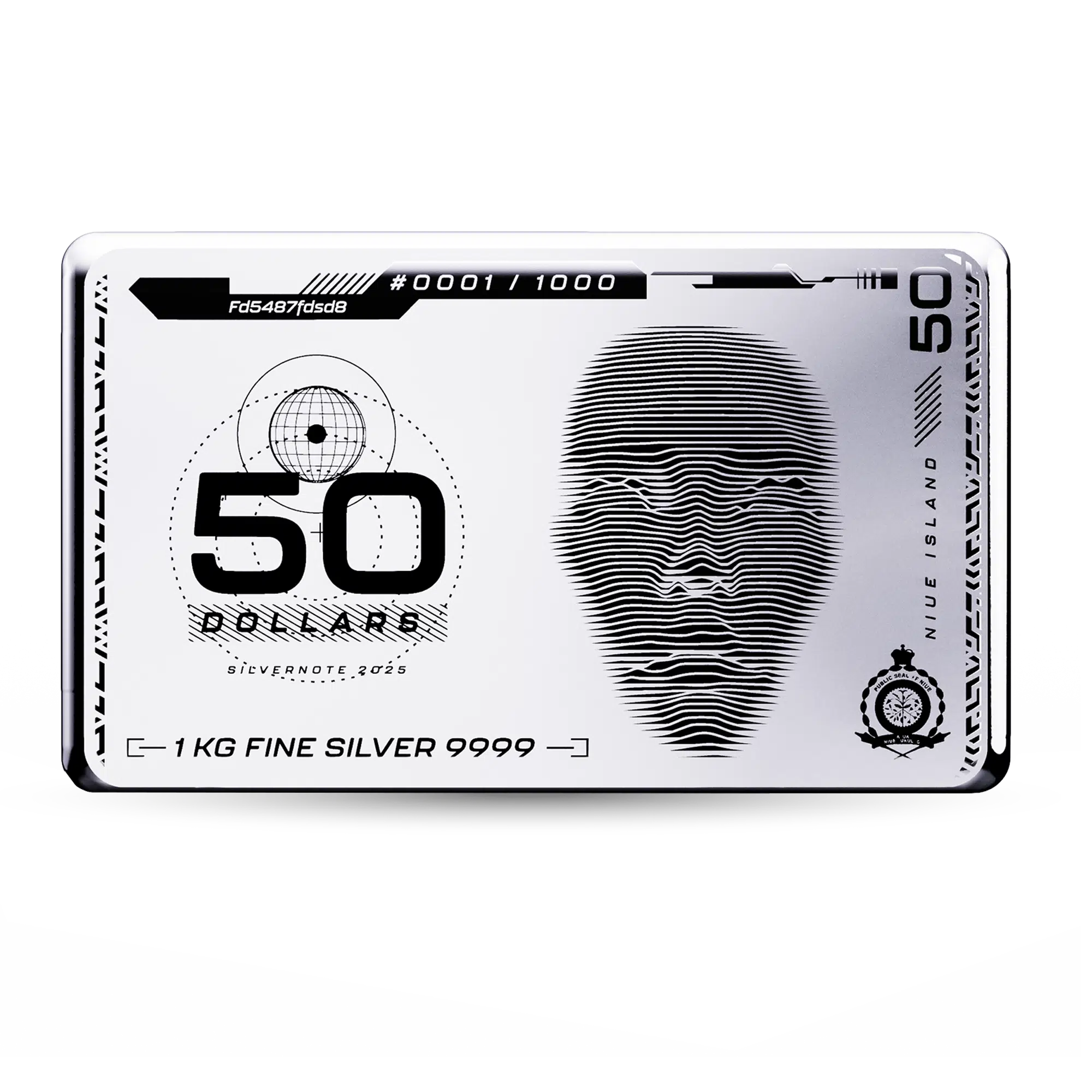 La barra de monedas de plata Niue 2025 combina el formato de una barra de lingotes con el estatus de moneda de curso legal. Acuñada a partir de 1 kilogramo de plata de ley 0,9999, tiene un valor nominal de 50 NZD y está limitada a sólo 1.000 piezas en todo el mundo. El formato rectangular (93,5 × 58 mm, 18,5 mm de grosor) realza su estética moderna y técnica. El diseño incorpora elementos gráficos de seguridad, numeración de serie y un retrato estilizado formado por patrones de líneas dinámicas. La audaz inscripción "50 DOLLARS" subraya su curso legal, mientras que "1 KG FINE SILVER 9999" destaca su pureza como moneda de inversión. Por su elevada finura, su peso considerable y su acuñación limitada, este lingote de un kilo de monedas de plata destaca como una emisión distintiva que atrae tanto a coleccionistas como a inversores serios en metales preciosos.