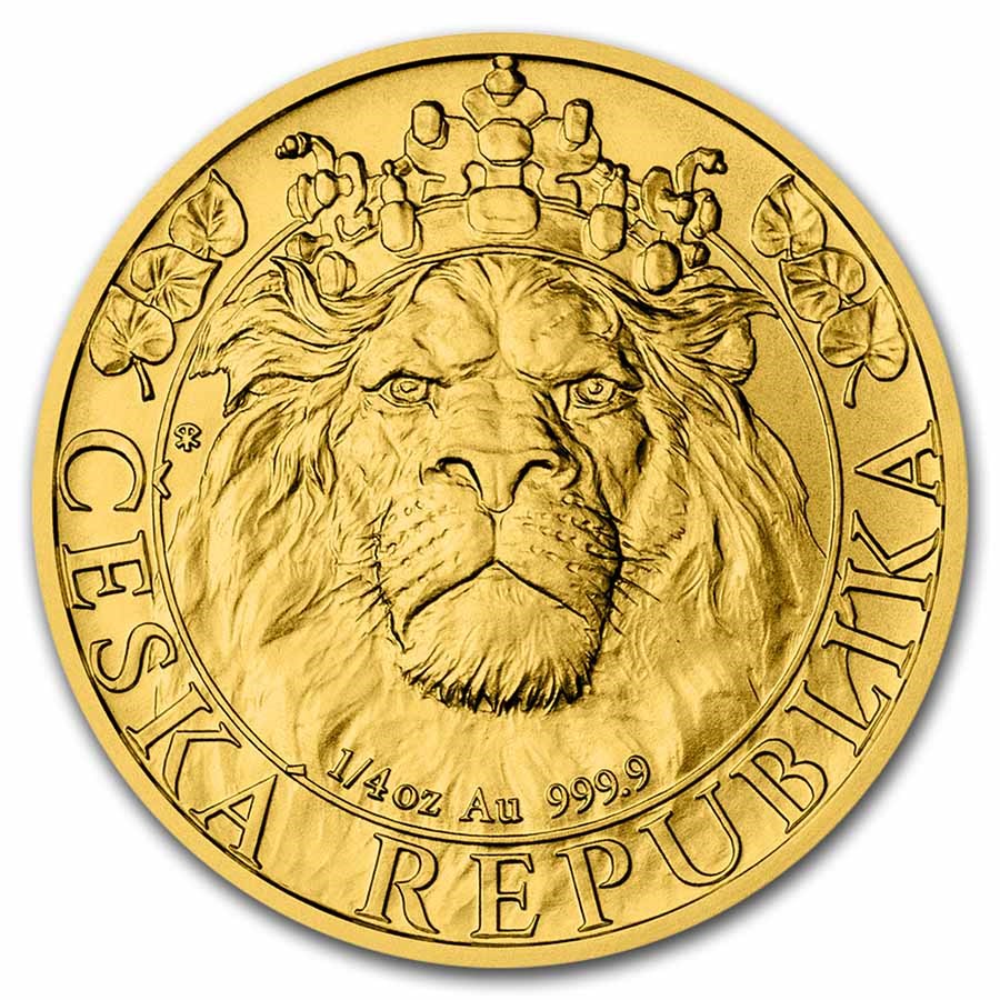 La moneda de oro Czech Lion 1/4 oz 2022 continúa la popular serie de monedas de la Fábrica de la Moneda checa con un diseño completamente actualizado en su cuarta edición. El reverso muestra el famoso león checo de dos colas con la corona de San Wenceslao y una rama de tilo, símbolos del Estado checo. En el anverso figura un retrato de perfil de Su Majestad la Reina Isabel II, la denominación y el año de emisión. La moneda contiene 1/4 onza de oro puro 9999 y es una edición limitada de sólo 4.970 piezas.