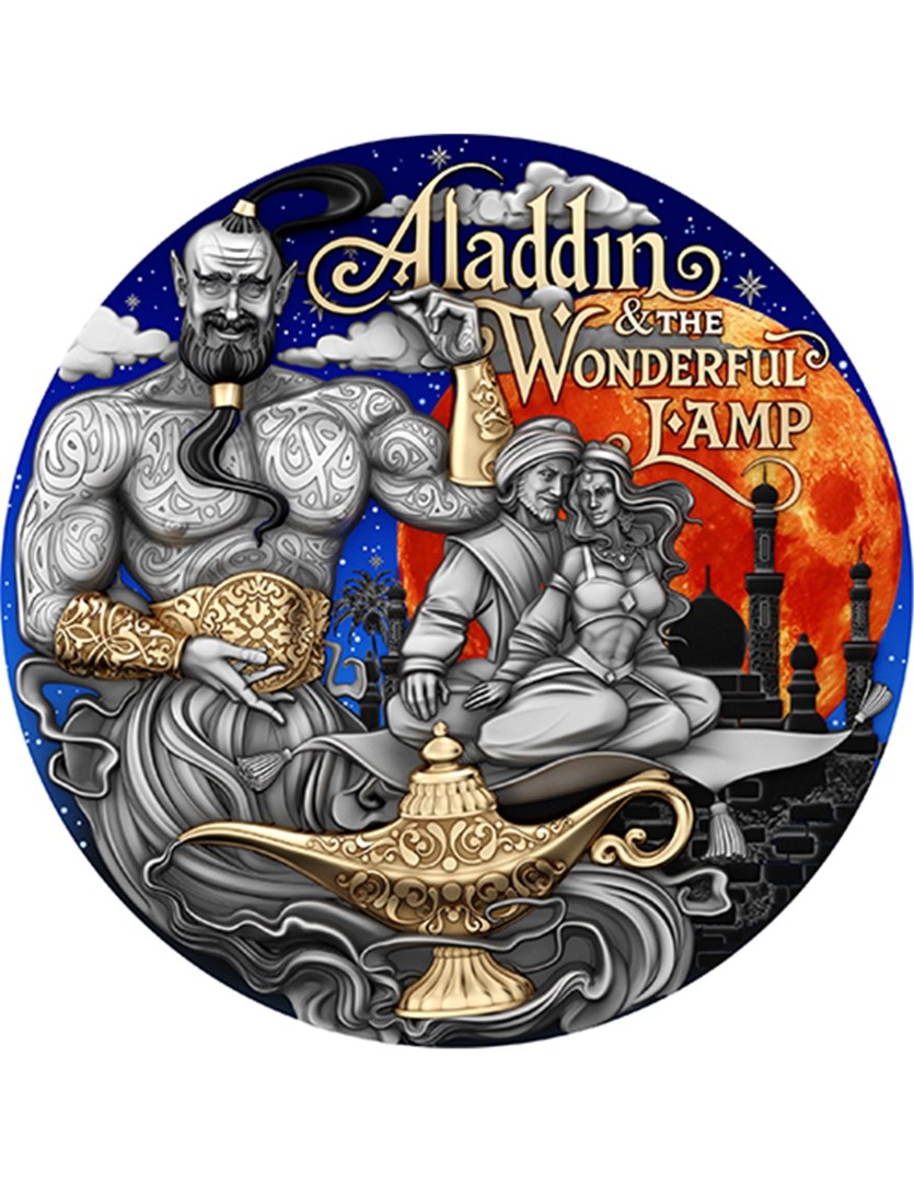 Esta encantadora moneda de plata de 2 onzas forma parte de la serie Cuentos de Hadas y está dedicada a la leyenda de Aladino, un joven soñador cuyo valor cambió su destino. En el centro del diseño aparece una escena en la que Aladino y Jasmine se elevan en una alfombra mágica bajo una luna ardiente, custodiados por el majestuoso Genio, guardián de los secretos de los deseos y la libertad. La moneda presenta un acabado antiguo, realzado con un dorado selectivo y una llamativa impresión UV. Se entrega en un estuche con certificado de autenticidad. La tirada limitada es de sólo 500 piezas en todo el mundo.