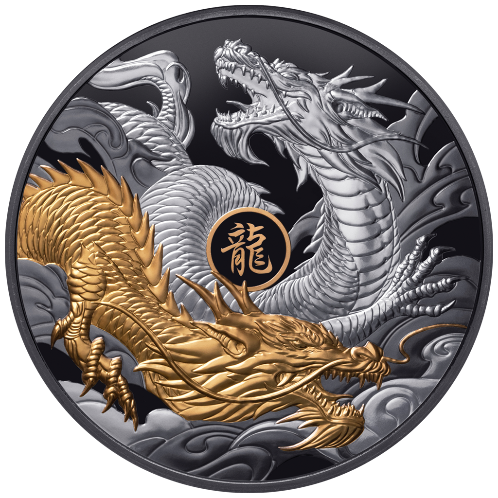 Esta impresionante moneda de plata de 5 onzas está dedicada al dragón, el quinto animal del calendario lunar. El reverso muestra dos dragones entrelazados, uno de ellos realzado con un dorado selectivo, con el carácter chino "Dragón" situado en el centro. La moneda destaca por su refinado diseño, su expresivo relieve, sus exclusivos detalles dorados y su distintiva calidad Black Proof. La moneda se presenta en un estuche de madera y va acompañada de un certificado de autenticidad. La tirada está estrictamente limitada a 888 piezas en todo el mundo.