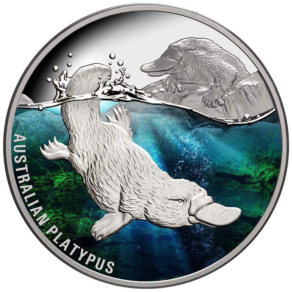 Una hermosa moneda de plata emitida en edición limitada con el uso de la impresión tampo, dedicada al increíble mamífero - ornitorrinco.