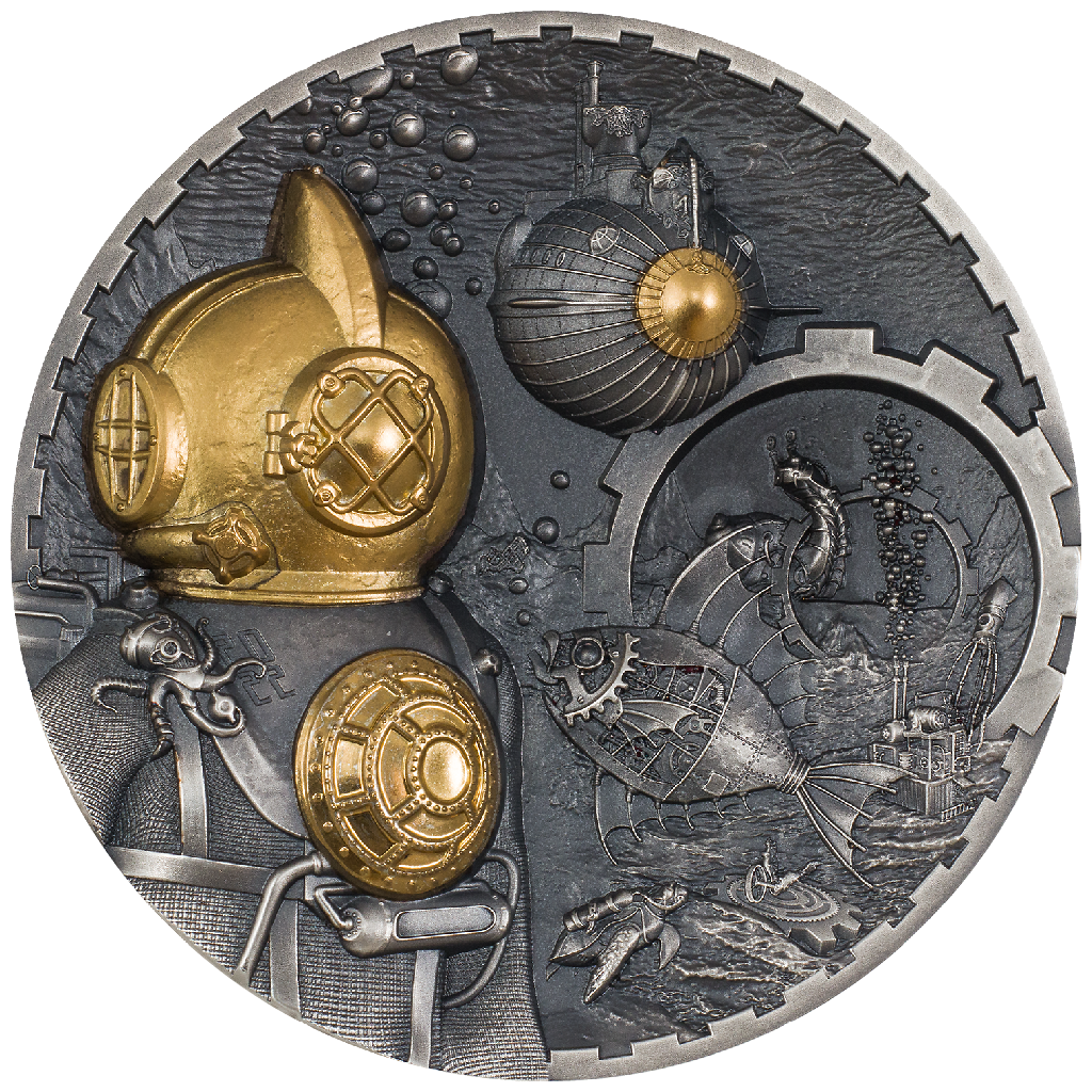 Moneda de plata exclusiva con muchos detalles finos y acuñación en altorrelieve. La moneda, de estilo steampunk, representa a un conquistador del fondo marino, con escafandra blindada, sobre el fondo de un submarino que se aleja y una variedad de criaturas tecnogénicas y mecánicas que habitan el mar y las profundidades oceánicas.