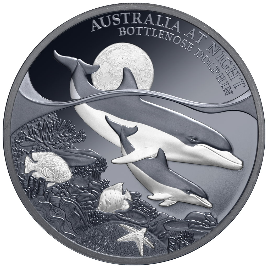 Niue: moneda de colección de plata Australia de Noche. Delfín mular 2025, Proof, 31,1 g plata pura (0,999)