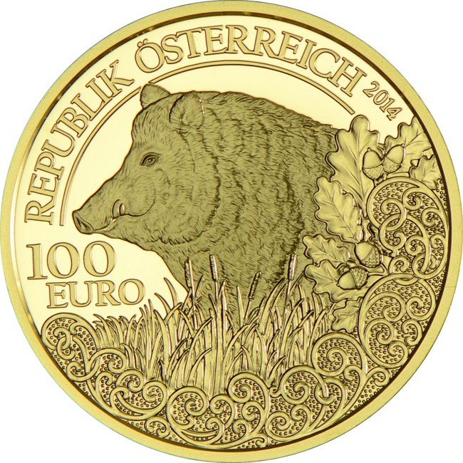Moneda de oro austriaca "Vida salvaje. Jabalí" proof, 2014, 16 g. oro puro (0,986 proof)